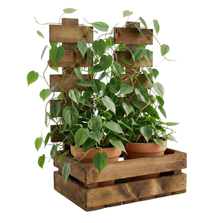 Rustykalny Ogród w Twoim Domu Ciemny brąz drewna pięknie kontrastuje z soczystą zielenią roślin. Wysoka tylna ścianka (47 cm) pełni rolę naturalnej podpory.