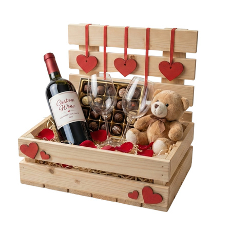 1,5 metra czerwonej wstążki (w jednym kawałku). Dlaczego tak? Abyś mógł/mogła dopasować długość wstążek do zawartości skrzynki! Jeśli wkładasz wysokie wino – zawiąż serca wyżej. Jeśli niskie słodycze – niech wiszą niżej. Masz pełną swobodę.